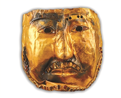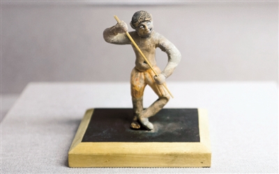 走進展廳,首先看到的展品是戰(zhàn)國時期銅武士像,于1983年出土于伊犁哈薩克自治州新源縣鞏乃斯河南岸的墓葬中。武士上身直挺,頭戴希臘式武士盔,盔上高高凸起長盔纓,目光堅毅嚴肅,下身半跪,雙拳緊握,原來應(yīng)握有器物,披甲帶器,像是正在接受命令安排,即將奔赴戰(zhàn)場。銅武士像旁邊是出土于同一地點的翼獸銅環(huán),環(huán)體中空,環(huán)圈前部有小亞細亞、西亞等地流行的高浮雕翼獸,可能為祭祀之用。配合著展廳左壁懸掛的新疆風(fēng)景圖畫,斑駁的青銅講述著它們于這片蒼茫天地間的過往,他們曾熟練地鑄造青銅,舉行盛大隆重的祭祀,武士們?yōu)椴柯涠鴳?zhàn),曾與希臘化世界有著深入的交往。