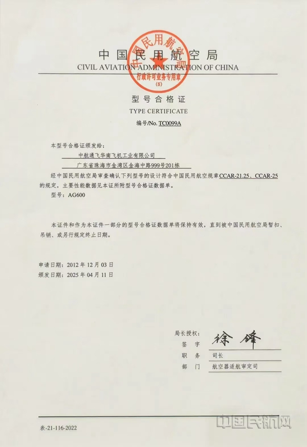 《中國民航報》、中國民航網(wǎng) 記者楊群峰 報道:輕舟已過萬重山,風(fēng)勁揚帆正當(dāng)時。4月20日,我國首次按照中國民航適航規(guī)章完全自主研制的AG600飛機在京獲頒中國民航局型號合格證,標(biāo)志著全球起飛重量最大的民用水陸兩棲飛機通過了嚴(yán)格測試和驗證,研制取得圓滿成功,獲得市場“準(zhǔn)入證”。