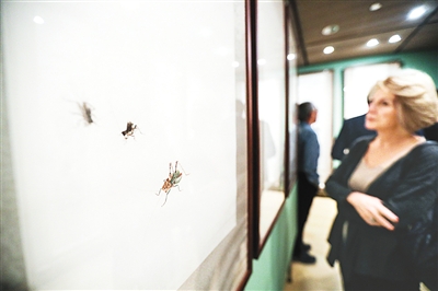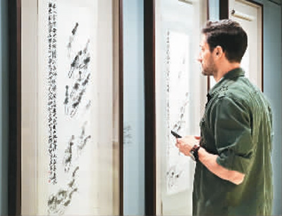 一位希臘觀眾用放大鏡認(rèn)真觀察齊白石筆下豐富的墨色變化