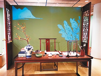 為了營造中國人讀書作畫的現(xiàn)場,展覽專門復(fù)原了一個(gè)中式書房,觀眾可拍照留念,也可在此手持毛筆畫卷,體驗(yàn)中國人的書寫方式。