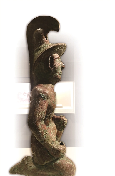 走進(jìn)展廳,首先看到的展品是戰(zhàn)國(guó)時(shí)期銅武士像,于1983年出土于伊犁哈薩克自治州新源縣鞏乃斯河南岸的墓葬中。武士上身直挺,頭戴希臘式武士盔,盔上高高凸起長(zhǎng)盔纓,目光堅(jiān)毅嚴(yán)肅,下身半跪,雙拳緊握,原來(lái)應(yīng)握有器物,披甲帶器,像是正在接受命令安排,即將奔赴戰(zhàn)場(chǎng)。銅武士像旁邊是出土于同一地點(diǎn)的翼獸銅環(huán),環(huán)體中空,環(huán)圈前部有小亞細(xì)亞、西亞等地流行的高浮雕翼獸,可能為祭祀之用。配合著展廳左壁懸掛的新疆風(fēng)景圖畫,斑駁的青銅講述著它們于這片蒼茫天地間的過(guò)往,他們?cè)炀毜罔T造青銅,舉行盛大隆重的祭祀,武士們?yōu)椴柯涠鴳?zhàn),曾與希臘化世界有著深入的交往。