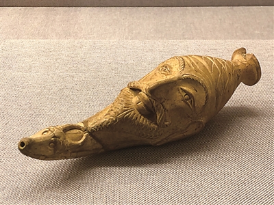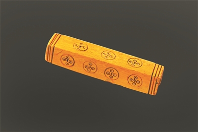 展品中的骨博具則與另一座城有關(guān)。骨博具是中原地區(qū)文化娛樂(lè)生活中常見(jiàn)的器具,類似今天的骰子。展出的這件骨博具出土于新疆卓爾庫(kù)特古城晚期地層魏晉十六國(guó)時(shí)期的房址中。以大型動(dòng)物骨骼磨制而成,長(zhǎng)方形,中空,兩端各刻三道橫槽,中間分別刻1至4個(gè)圓圈,每個(gè)圓圈中間有4個(gè)小圓,小圓中心帶孔,古樸精致。