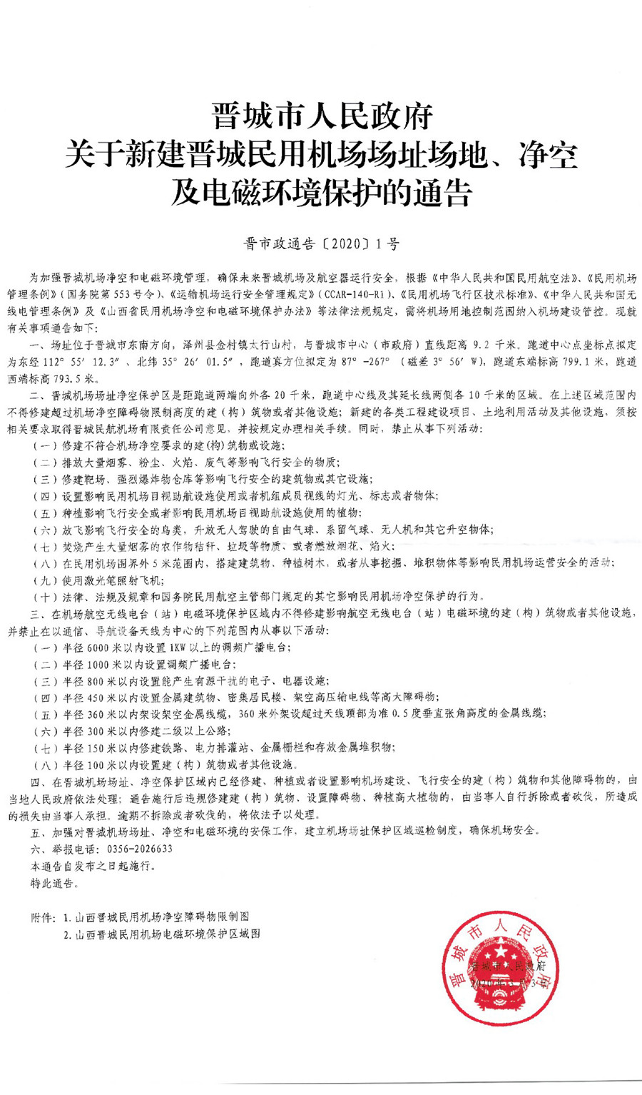晉城市人民政府關(guān)于新建晉城民用機(jī)場(chǎng)場(chǎng)址場(chǎng)地、凈空及電磁環(huán)境保護(hù)的通告